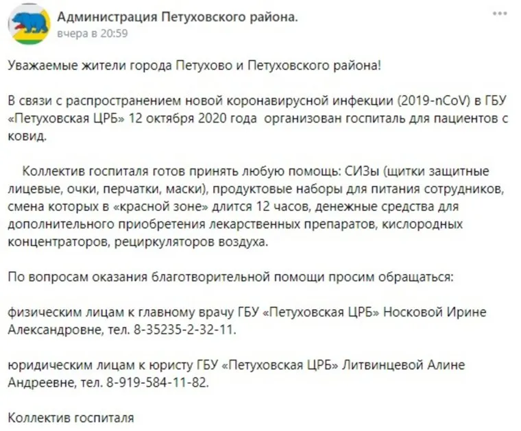 «Коллектив госпиталя готов принять любую помощь: СИЗы (щитки защитные лицевые, очки, перчатки, маски), продуктовые наборы для питания сотрудников, смена которых в „красной зоне“ длится 12 часов, денежные средства для дополнительного приобретения лекарственных препаратов, кислородных концентраторов, рециркуляторов воздуха», — говорится в сообщении. По всем вопросам желающие помочь могут обратиться к главврачу Петуховской ЦРБ Ирине Носковой и юристу Алине Литвинцевой. Госпиталь для пациентов с коронавирусом открыт на базе ЦРБ 12 октября.