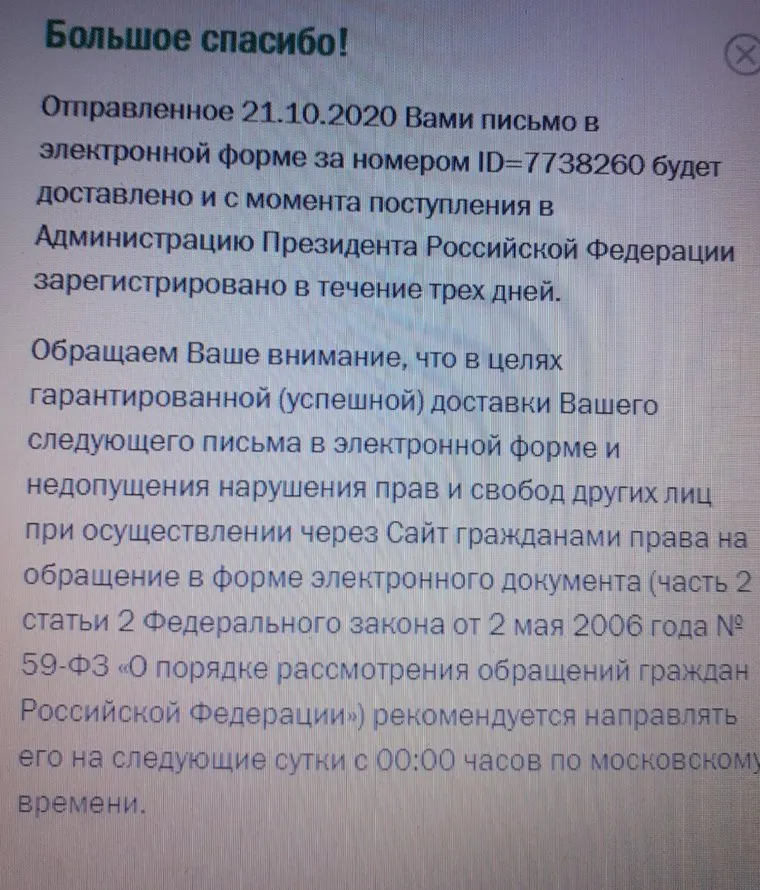 Обращение направлено на сайт администрации президента РФ