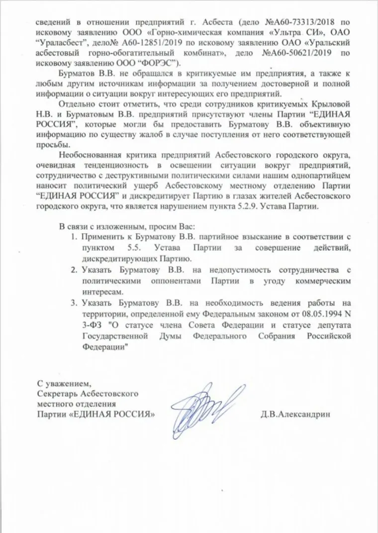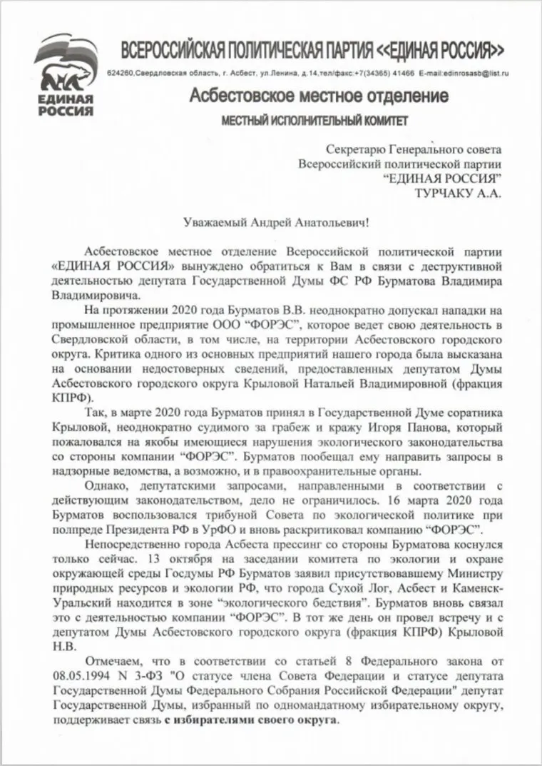 «На протяжении 2020 года Бурматов В.В. неоднократно допускал нападки на ООО „ФОРЭС“, которое ведет свою деятельность в Свердловской области, в том числе на территории Асбестовского городского округа. Критика <…> была высказана на основании недостоверных сведений, предоставляемых депутатом думы Асбестовского городского округа Крыловой Натальей Владимировной (фракция КПРФ)», — пишет Александрин. Он также отметил связи Крыловой со «Штабом Навального» и нежелательной организацией «Открытая Россия».