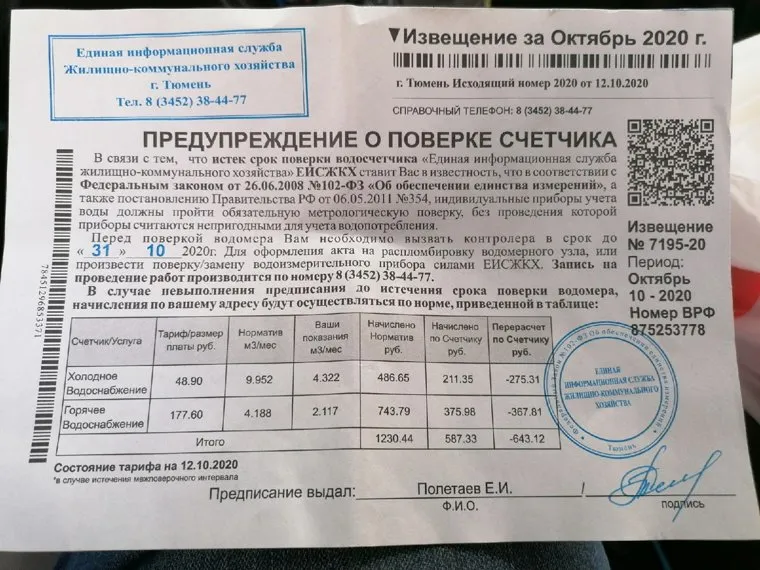 «Вот эти, не знаю, как их назвать, предлагают поверку счетчика за 1 100 рублей. При стоимости счетчика 550 рублей», — рассказывает пользователь Сергей Петровский в группе «Тюмень Online» соцсети «ВКонтакте». К гневному сообщению мужчина прикладывает фото извещения. Согласно ему, некая «Единая информационная служба Жилищно-коммунального хозяйства» предупреждает потребителя, что его счетчику нужна поверка, иначе платить за воду придется не по показаниям, а по нормативу.