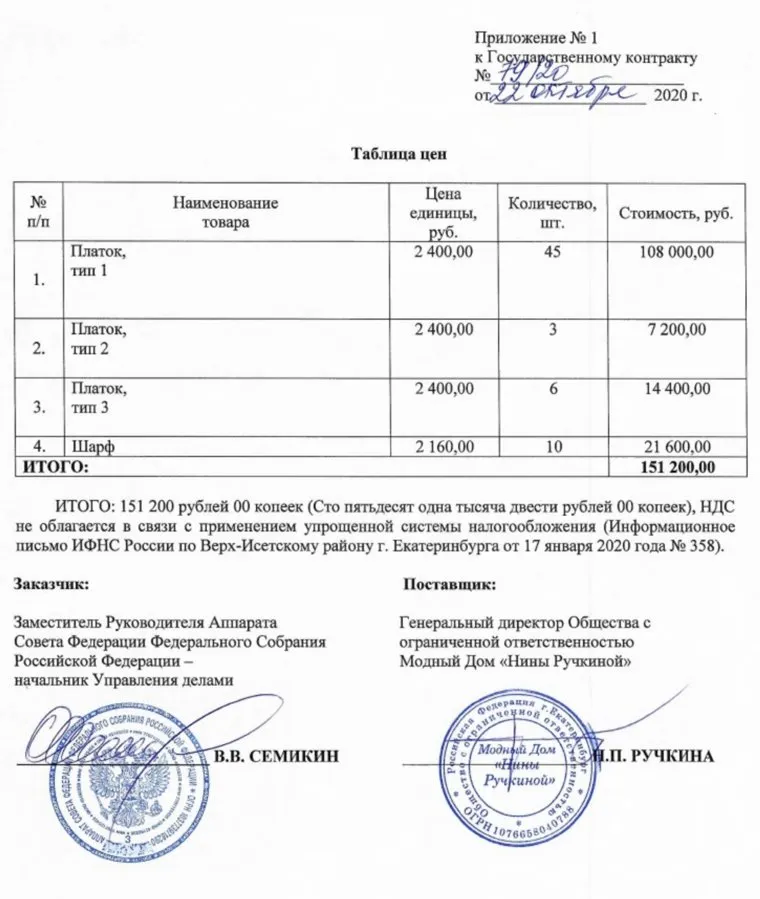 «Аппарат Совета Федерации РФ с одной стороны, и Общество с ограниченной ответственностью Модный Дом „Нины Ручкиной“ с другой стороны, заключили настоящий Государственный контракт о нижеследующем: Поставщик обязуется поставить заказчику в 2020 году сувенирную продукцию (платки, шарфы) для обеспечения нужд Совета Федерации Федерального Собрания РФ», — говорится в тексте государственного контракта.