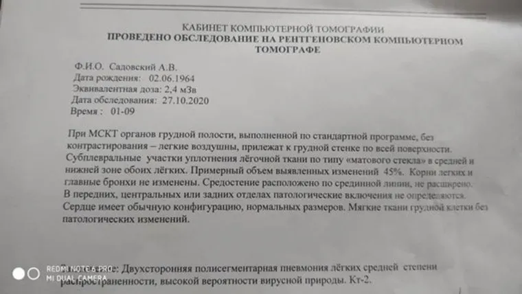 У самого Алексея КТ показало поражено 45% легких, при этом сатурация (насыщение легких кислородом) — 97%, что удивило медиков, которые его смотрели. «Наверное это потому, что я 30 лет занимался авиамоделизмом — там приходилось нахаживать по 10 км на свежем воздухе», — пояснил URA.RU Садовский. Сейчас он находится в ГКБ №14, ночью ему сделали капельницу, температура 36,6, кровать оборудована кислородом, но ему его не дают. «Говорят, не кислородный», — пишет блогер, обещая и далее рассказывать о своей жизни в больнице.