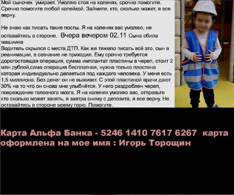 В личном аккаунте депутата неизвестные разместили четыре изображения, на одном из которых — сын Торощина, фотографию которого политик публиковал несколько недель назад. Рядом с картинкой текст с множеством пунктуационных и грамматических ошибок: «Мой сыночек умирает. Срочно помогите любой копейкой. Займите, кто сколько может, я все верну. Вчера вечером 02.11 сына сбила машина. Водитель скрылся с места ДТП. Сын в реанимации, в сознание еще не приходил. Ему срочно требуется дорогостоящая операция, сумма имплантат пластины в череп, стоит 2 млн рублей, сама операция бесплатная, нужна только пластина которая индивидуально делается под каждого человека. У меня есть 1.5 миллиона. Без денег он не выживет».