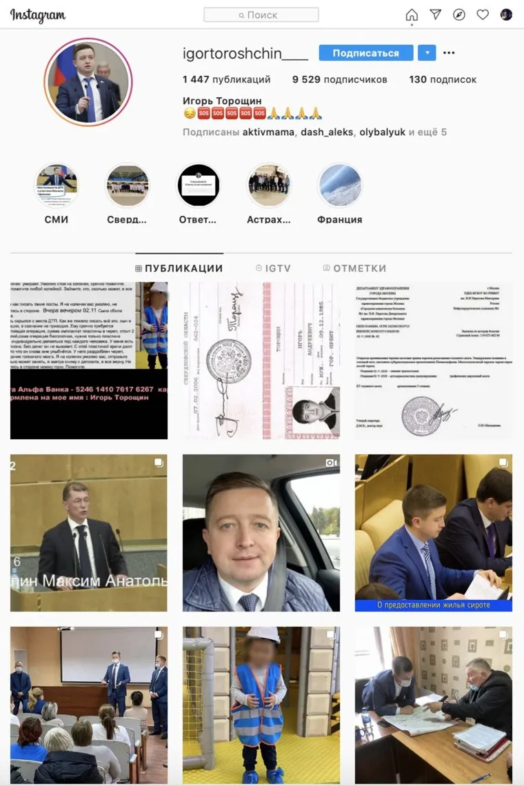 Игорь Торощин подтвердил факт взлома страницы в Instagram (деятельность запрещена в РФ): «Мою страницу в инстаграм (деятельность запрещена в РФ) взломали! Не переводите деньги. Если кто-то из Вас знает, как быстро восстановить доступ, буду благодарен за помощь», — написал парламентарий в Facebook (деятельность запрещена в РФ).