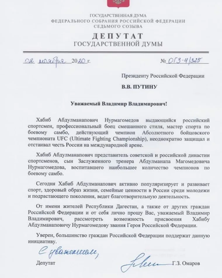 «Прошу вас, уважаемый Владимир Владимирович, рассмотреть возможность присвоения Хабибу Абдулманаповичу Нурмагомедову звания Героя Российской Федерации», — говорится в тексте обращения, которое Омаров разместил на своей странице. Депутат Госдумы отметил, что Нурмагомедов является достойным примером для молодежи. Среди подрастающего поколения российский боец активно популяризирует спорт, здоровый образ жизни и семейные ценности, подчеркнул Омаров.