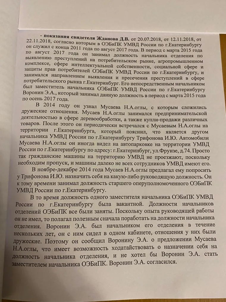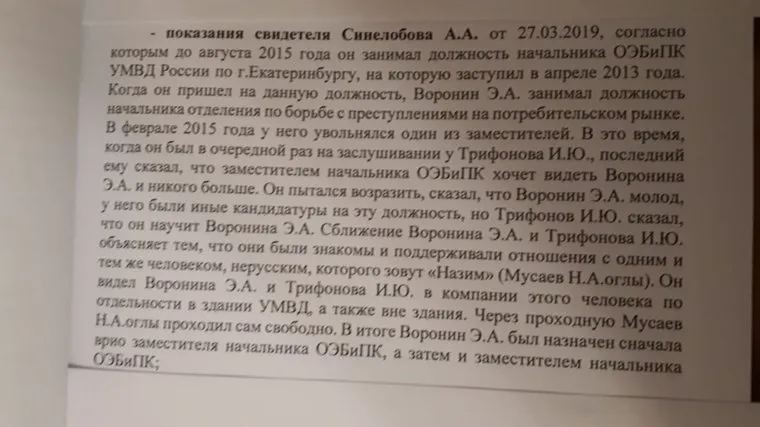 Об особых отношениях говорил и другой офицер УМВД Екатеринбурга — Синелобов. Последний до августа 2015 года работал начальником ОЭБ и ПК городской полиции и часто видел Жданова, Трифонова и Мусаева в одной компании. Известно, что именно Мусаев способствовал назначению в 2015 году Эдуарда Воронина на должность главного антикоррупционера УМВД Екатеринбурга.