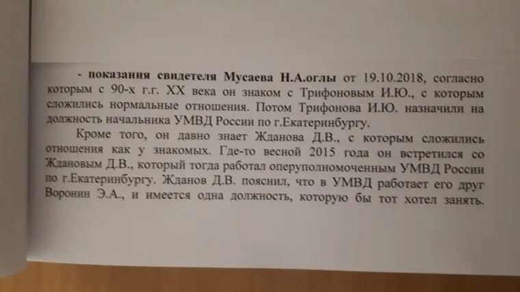 «В ноябре—декабре 2014 года Мусаев предлагал [сотруднику ОЭБ и ПК УМВД Екатеринбурга] Денису Жданову попросить у Трифонова какую-либо руководящую должность в городской полиции», — говорит источник URA.RU, ссылаясь на показания самого Дениса Жданова. Последний свидетельствовал об этом в 2018 году, сообщая следствию о том, что Мусаев не только имел пропуск на территорию УМВД Екатеринбурга, но и свободно входил в кабинет начальника управления Игоря Трифонова.