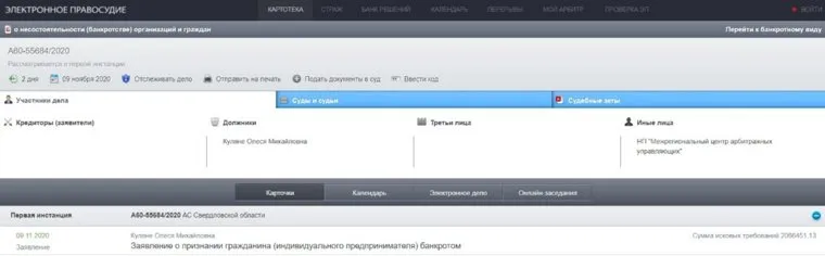Пресс-секретарь УМВД по Екатеринбургу Олеся Куляне, предположительно, проходит через процедуру банкротства как физлицо. Как следует из картотеки арбитражного суда Свердловской области, 9 ноября в инстанцию обратилась полная тезка Куляне. Сумма исковых требований, указанная на сайте, 2,07 миллиона рублей.