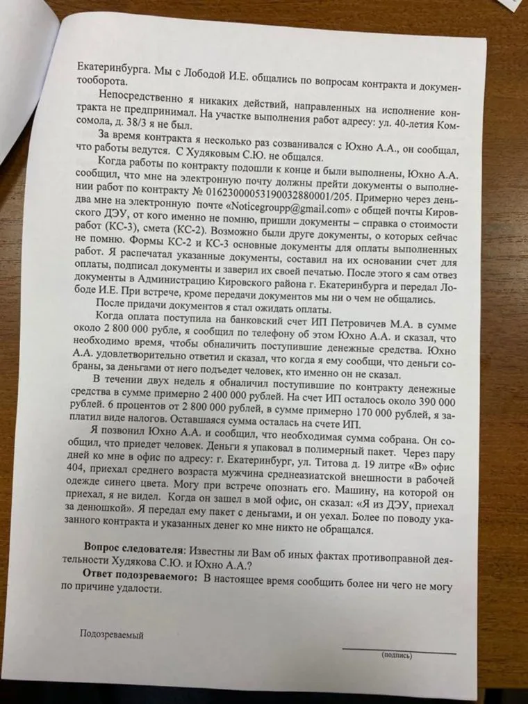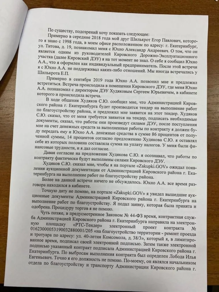 URA.RU стали известны детали показаний, которые предприниматель дал на руководство Кировского ДЭУ. Он рассказал на допросе, что один из руководителей ДЭУ Александр Юхно в сентябре 2019 пригласил его на встречу с директором ДЭУ Сергеем Худяковым, который предложил ему заявиться на тендер по благоустройству. Выполнять сами работы не требовалось (они должны были быть сделаны силами муниципального предприятия) — нужно было лишь обналичить и отдать 86% суммы контракта.
