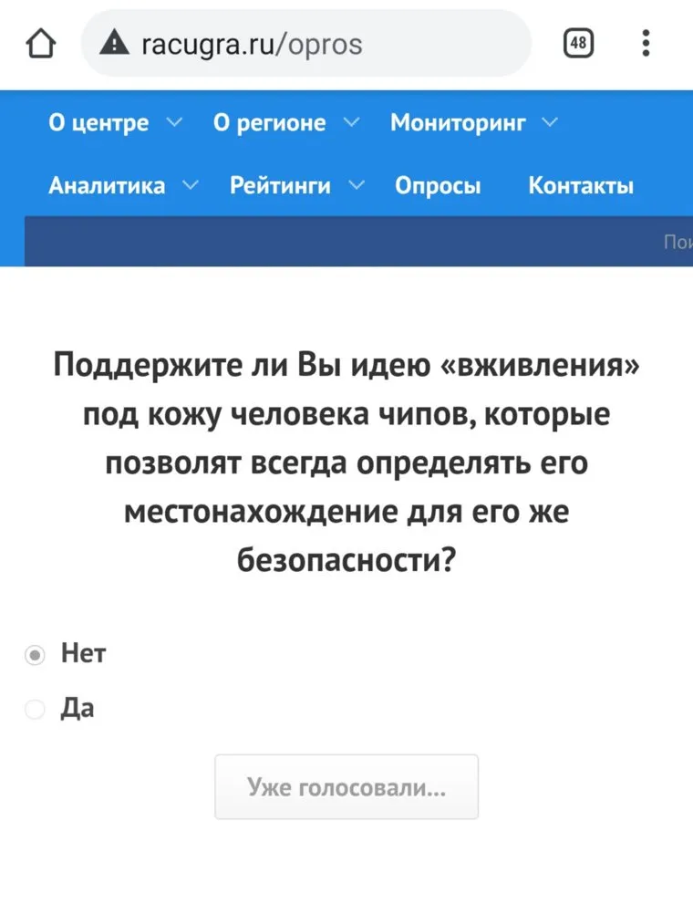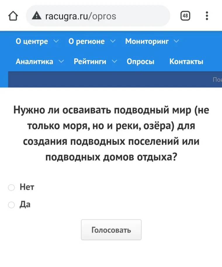 Жителям ХМАО предложили пройти опрос, в ходе которого нужно ответить на вопросы о вживлении чипов под кожу человека, а также о строительстве подводных поселений в озерах и реках. Такое социсследование опубликовано на сайте бюджетного учреждения «Региональный аналитический центр», которое занимается прогнозированием социально-экономического развития Югры.