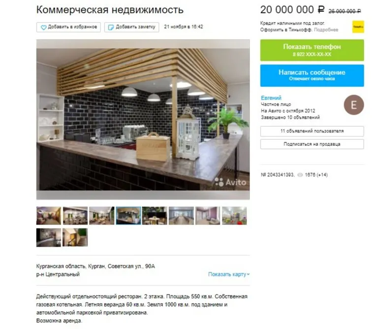 На Avito самый дорогой объект изначально выставлялся за 26 млн рублей. Затем его цену владелец снизил до 20 млн рублей. «Действующий отдельно стоящий ресторан. Два этажа. Собственная газовая котельная. Летняя веранда. Земля под зданием и автомобильной парковкой приватизирована», — говорится в объявлении.