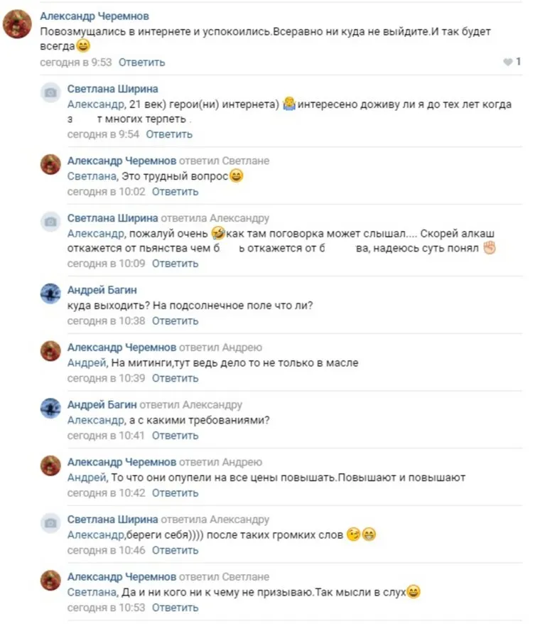В комментариях горожане согласились с автором, что цены на продукты растут. Но некоторые написали, что все недовольство так и останется в Сети. «Повозмущались в интернете и успокоились. Все равно никуда не выйдете», — написал Александр Черемнов. «Куда выходить? На подсолнечное поле, что ли?» — уточнил Андрей Багин. «На митинги. Тут ведь дело-то не только в масле», — ответил Черемнов.