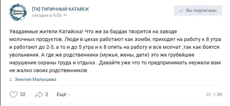 «Что за бардак творится на заводе молочных продуктов. Люди в цехах работают, как зомби. Приходят на работу к 8:00 и работают до 2:00—3:00, а то и до 5:00. А к 8:00 опять на работу, и все молчат», — написала в группе «Типичный Катайск» Эмилия Малышева.