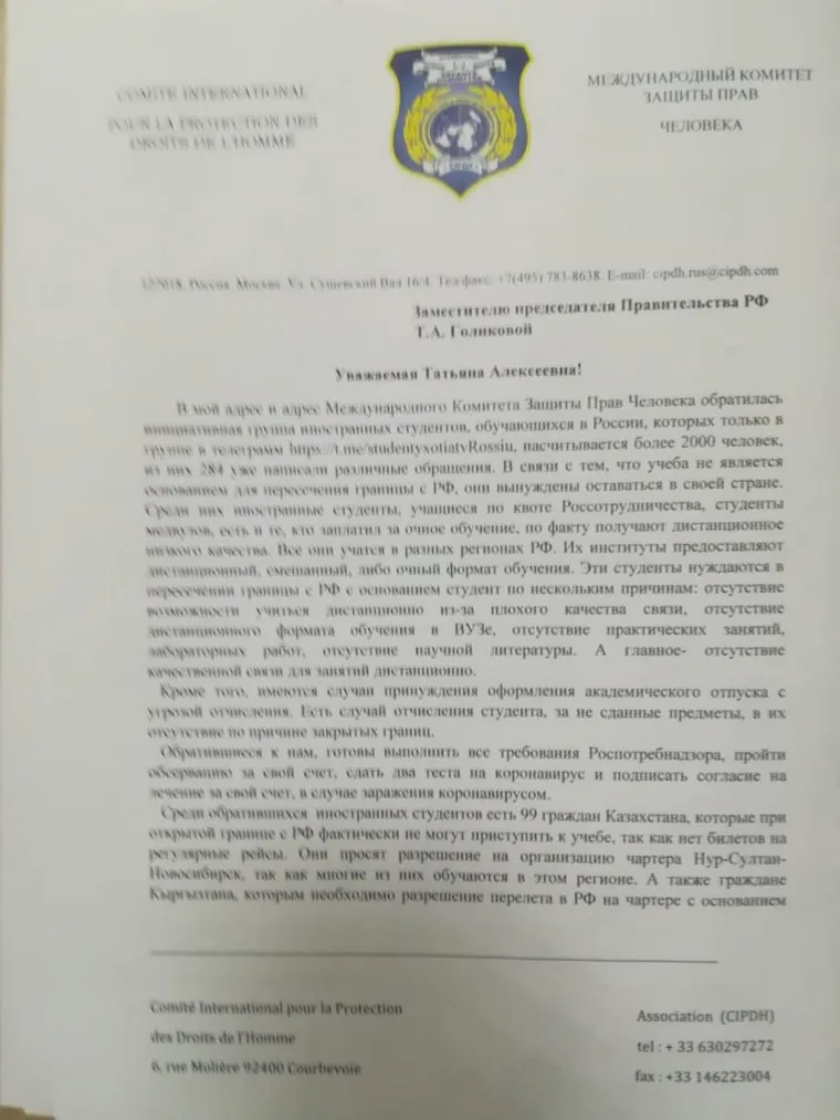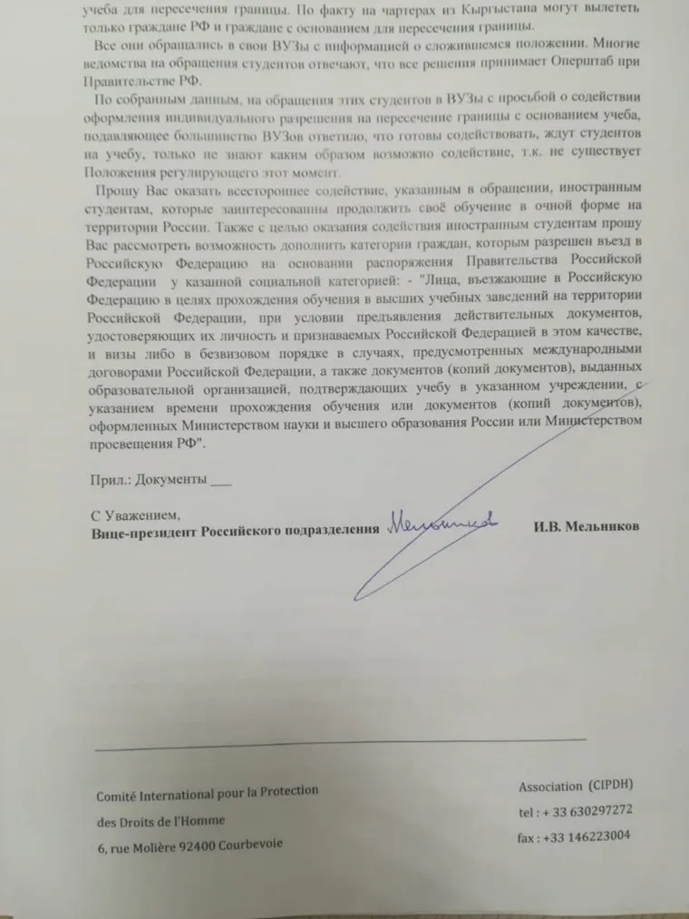 Мельников обратился к заместителю главы правительства РФ Татьяне Голиковой с просьбой оказать содействие иностранным студентам. В частности, сделать обучение основанием для въезда в Россию, организовать чартерные рейсы из других стран.