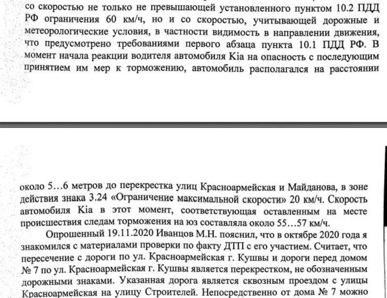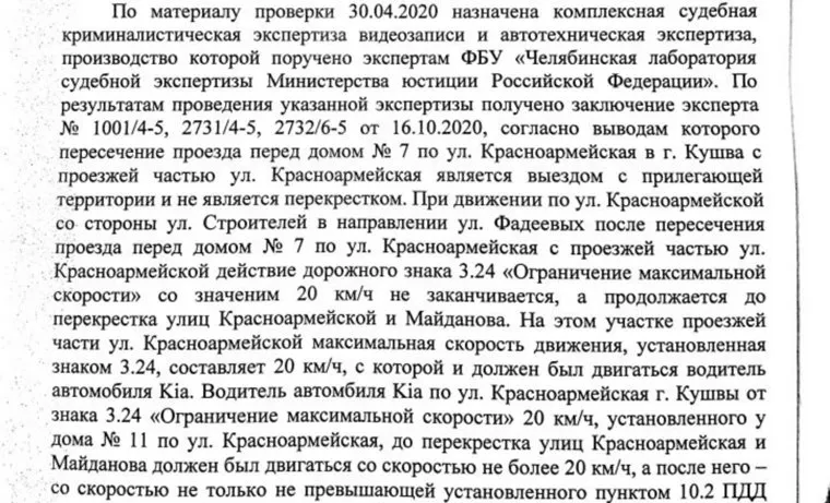 Материалы проверки лежат в СК Кушвы уже год. За это время сделано три экспертизы (две государственных и частная) — все они установили, что Иванцов ехал с превышением скорости: 55-57 км в час, хотя там действует знак 20 км/час. Но уголовное дело так и не возбуждено: следователи уже четырежды выносили отказ (последний раз — 23 ноября 2020 г.).