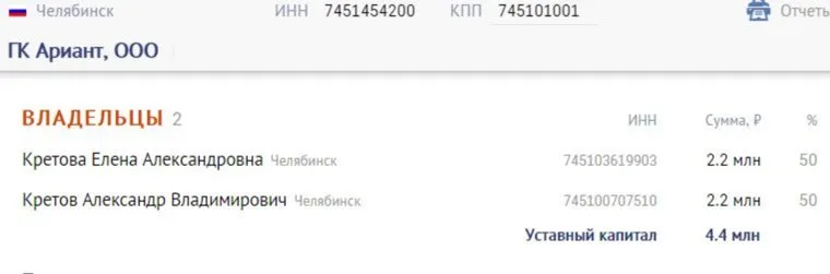 В налоговой инспекции зарегистрировали группу компаний «Ариант», директором которой стал Александр Кретов, зять челябинского бизнесмена Александра Аристова. Фирма принадлежит самому Кретову и его жене, Елене Кретовой.