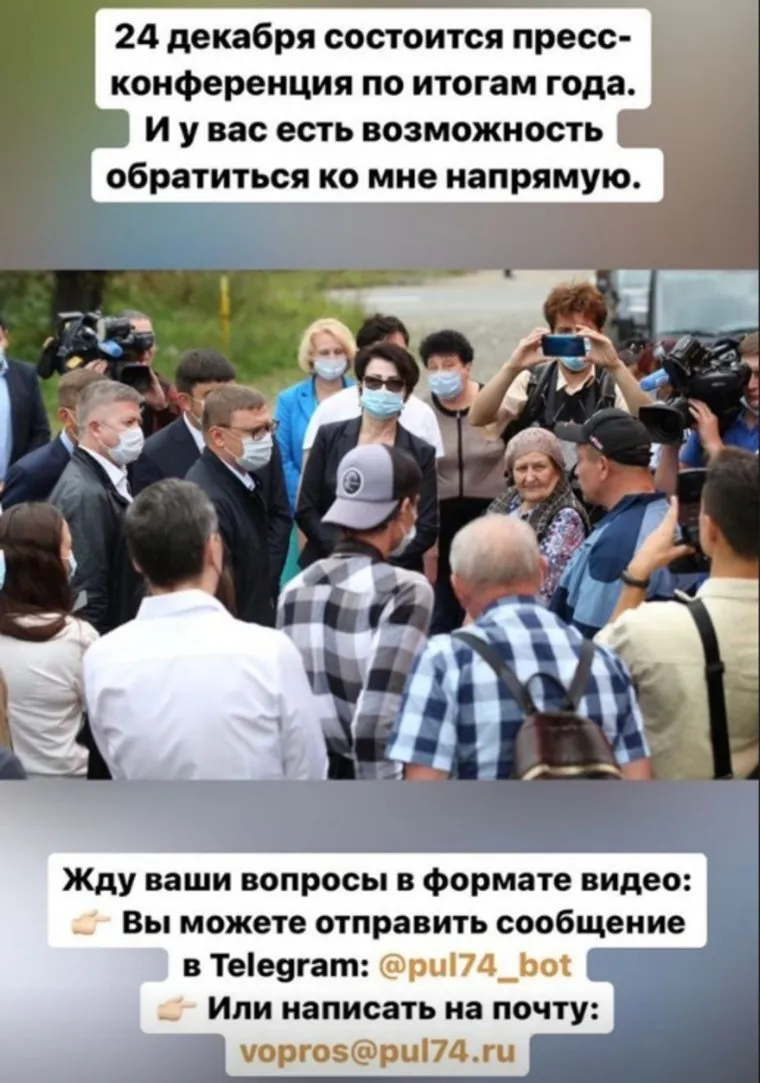 «24 декабря состоится пресс-конференция по итогам года. И у вас есть возможность обратиться ко мне напрямую. Жду ваши вопросы в формате видео в Telegram или на электронную почту», — написал глава региона в Instagram (деятельность запрещена в РФ).