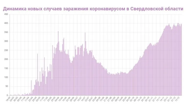 Согласно прогнозу , подготовленному в октябре в Центре мониторинга биологических рисков ФМБА, пик заболеваемости коронавирусом в России придется на середину декабря (см. график). В Свердловской области заболеваемость COVID последние три недели остается предельно высокой, пиковые значения фиксировались 11 и 12 декабря (по 402 и 401 случаю), 5 декабря (398 случаев) и 27 ноября (399). Рекордные показатели по смертности были 13 и 15 декабря (18 умерших от коронавируса).