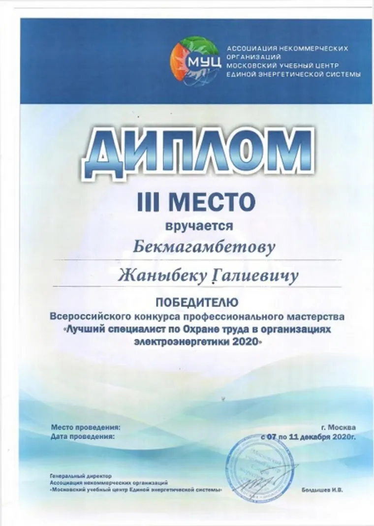 «Начальник службы производственного контроля и охраны труда Жаныбек Бекмагамбетов вошел в тройку лидеров. Организатором конкурса выступил Московский учебный центр Единой энергетической системы. Участники продемонстрировали теоретические знания и практические навыки, в том числе, оказания первой медицинской помощи», — сообщили в пресс-службе компании. Бекмагамбетов возглавляет службу производственного контроля и охраны труда СУЭНКО.