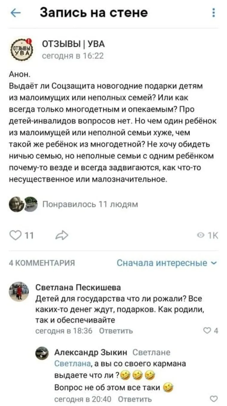 «Все каких-то денег ждут, подарков. Как родили, так и обеспечивайте», — написала Пескишева в паблике «Отзывы|Ува» во «Вконтакте». Также она поинтересовалась, для государства ли рожают детей. Затем комментарий удалили.