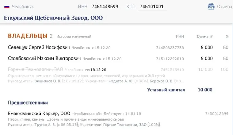 В ООО «Еткульский Щебеночный Завод» Селещуку и его компаньону Максиму Столбовскому принадлежат по 50% в уставном капитале. Компания занимается добычей декоративного и строительного камня, известняка, гипса, мела и сланцев; бетона и бетонных смесей. Иных значимых данных сервис не приводит. Получить комментарий Селещука на момент подготовки новости URA.RU не удалось.
