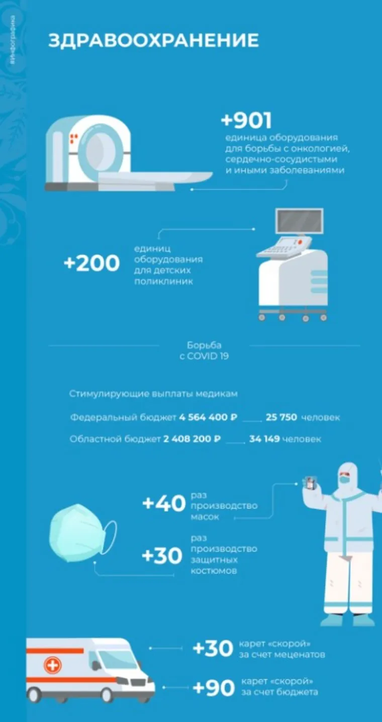 Глава региона анонсировал восстановление больницы в Зеленой роще, которая станет аналогом клиники Склифосовского, открытие других медицинских центров. Также внимание в программе уделяется созданию необходимых запасов медикаментов, СИЗов и продовольствия. Потратить на масштабную программу предполагается 72 млрд рублей.