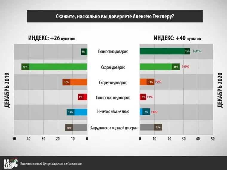 За год доля жителей Челябинска, полностью доверяющих губернатору Алексею Текслеру, выросла до 35%. Об этом сообщил руководитель исследовательского центра «МарС» Иван Полукаров по итогам соцопроса, сделанного по заказу URA.RU.