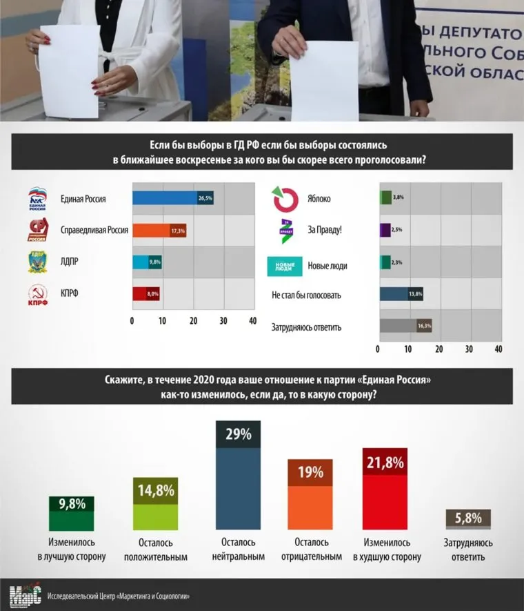 «Рейтинг „ЕР“ продолжает показывать отрицательную динамику, сейчас мы его зафиксировали на уровне 26,5%. За 2020 год отношении к партии изменилось в положительную сторону у 9,8% респондентов, в отрицательную — у 21,8% опрошенных, — пояснил Полукаров. — Любопытно, что партия „Новые Люди“ без всякой работы в Челябинске уже имеет базовый рейтинг на уровне партии „За Правду!“».