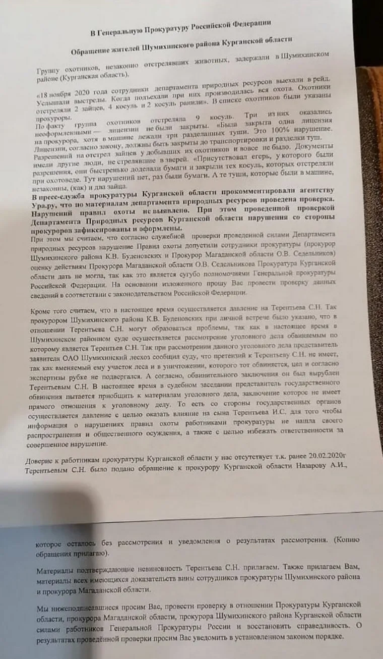 «Согласно служебной проверке департамента природных ресурсов, нарушение правил охоты допустили прокурор Шумихинского района К.В. Буденовских и прокурор Магаданской области О.В. Седельников. Прошу вас провести проверку», — говорится в письме Краснову, которое подписали семь человек.