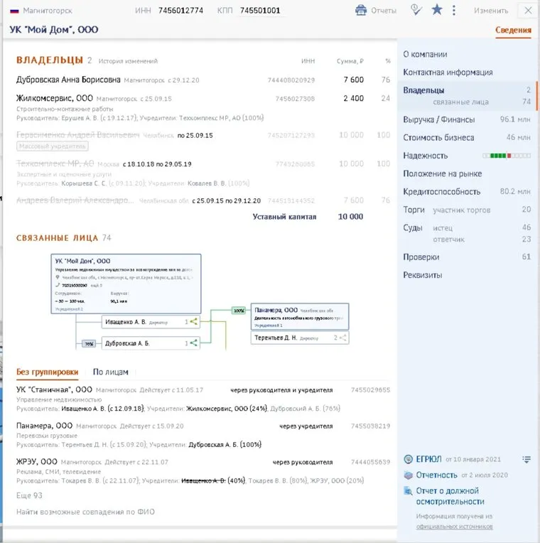 В УК «Мой дом» числится 72 сотрудника, она обслуживает 43 многоквартирных дома, расположенных в Орджоникидзевском районе в левобережной части Магнитогорска. Рыночная стоимость фирмы оценивается сервисом СБИС в 46 млн рублей. Выкупленная Дубровской доля ранее принадлежала Валерию Андрееву, выступавшему топ-менеджером в бизнес-империи бывшего главы региона.