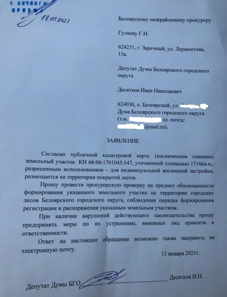 Встреча с межрайонным белоярским прокурором Генрихом Гулиевым состоялась 14 января. Кроме Десяткова на ней присутствовали еще три депутата. «Будет прокурорская проверка в отношении формирования этого земельного участка в зоне рекреации. Проверять будут администрацию, поскольку конечное решение о выделении земли принимают чиновники», — рассказал агентству Десятков. По словам депутата, на встрече обсудили земельные вопросы, поскольку по мнению местных парламентариев, махинации с землями случались и ранее.