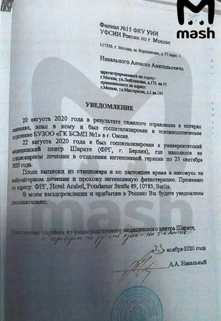 Сообщается, что Навальный уведомил ФСИН о своем местонахождении в Германии, где он проходил лечение, только один раз — 23 ноября. Тогда он заявил, что проходит реабилитацию и не знает, когда вернется в РФ. Однако о завершении лечения пациента клиника Charite сообщила в сентябре. После этого ФСИН решила, что Навальный уклоняется от контроля, и начала розыскные мероприятия. В конце декабря он был объявлен в розыск. Адвокат Навального Андрей Кобзев подтвердил СМИ подлинность опубликованного постановления, добавив, что по прибытии в Россию Навальный может быть арестован.