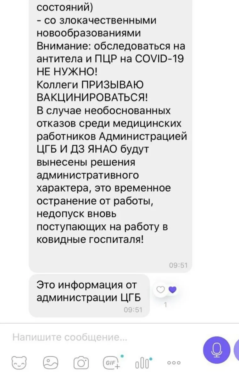 «Коллеги, призываю вакцинироваться! В случае необоснованных отказов среди медицинских работников администрацией ЦГБ и департаментом здравоохранения ЯНАО будут вынесены решения административного характера: это временное отстранение от работы, недопуск вновь поступающих на работу в ковидные госпитали», — говорится в сообщении, которое якобы распространяет руководство Ноябрьской больницы.