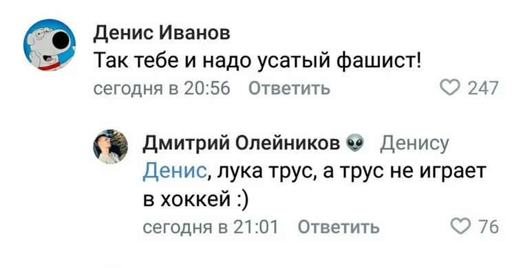 - Не забудем не простим19 января 2021 05:40А в Риге в марте марш СС . Пособники фашистов не осуждены. Нельзя там в хоккей играть. Стыдно.