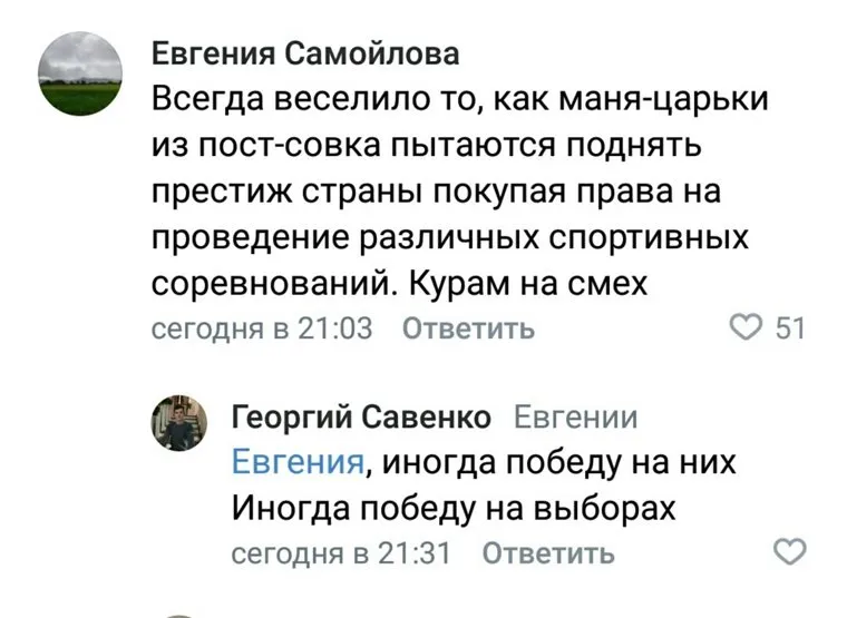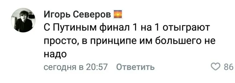 - Ольга19 января 2021 20:41Читаю и у меня ужас берет! Вашу страну,народ обижают,а вы радуетесь! Ну не будет чемпионата и бог с ним! Посмотрим по телевизору! Деньги потратим на другое.Пусть предатели,которые требовали санкции и байкот и другие требования возвращаются домой! Их ждет участь Навального. Обойдемся и без чемпионата!