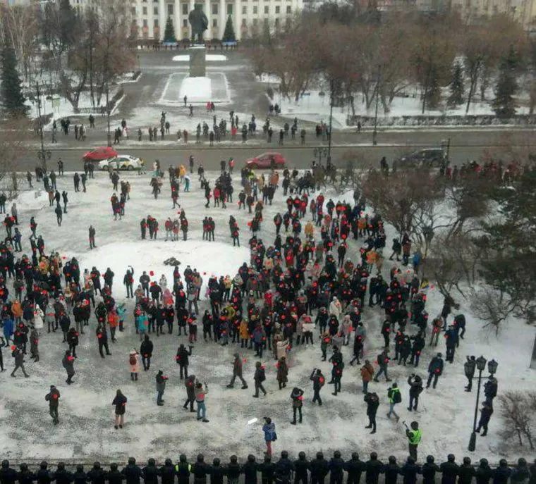 8:22 В Хабаровске, где на площади Ленина собрались около ста человек, также начались задержания. 23 января в Хабаровске на митинге собрались 250 человек. Задержаны шесть человек, среди них есть журналисты, сообщает «Новая газета». По данным издания, сначала протестующие просто общались, не выкрикивая лозунгов, а затем начали водить хоровод вокруг ледового городка.
