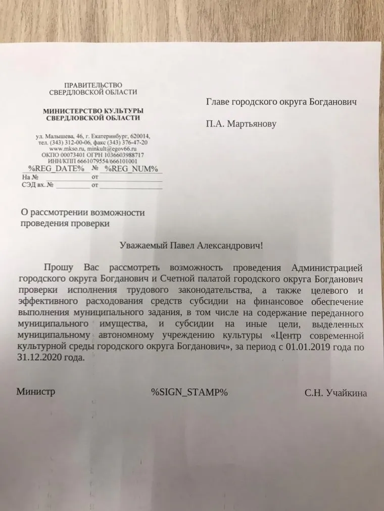 Министр просит главу муниципалитета Павла Мартьянова и городскую Счетную палату проверить соблюдение трудового законодательства и целевого расходования бюджетных средств. «Прошу вас рассмотреть возможность проведения… проверки исполнения трудового законодательства, а также целевого и эффективного расходования средств субсидии на финансовое обеспечение муниципального задания МАУК „Центр современной культурной среды городского округа Богданович“ с 01.01.2019 по 31.12.2020», — сказано в письме министра.