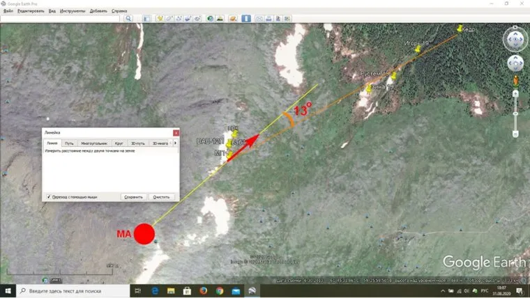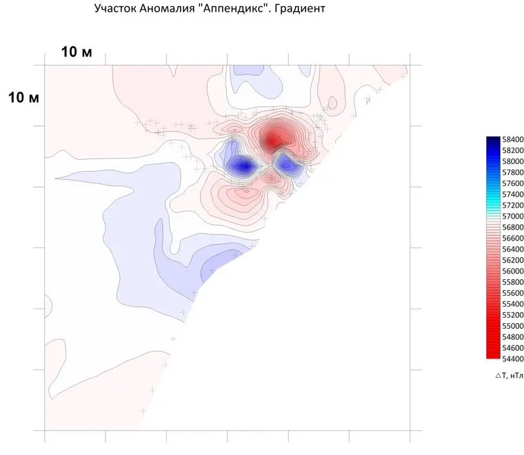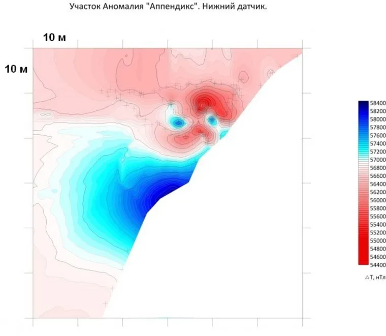 «Мои ожидания оправдались: в нескольких сотнях метрах от места палатки обнаружилась магнитная аномалия, — рассказал Александр Алексеенков. — Градиент (разброс) напряжения был от нескольких единиц до нескольких десятков единиц, а в том месте — аж до 1700 единиц, то есть разница — в несколько порядков». Анализ полученных данных был сделан впоследствии профессиональным георазведчиком.