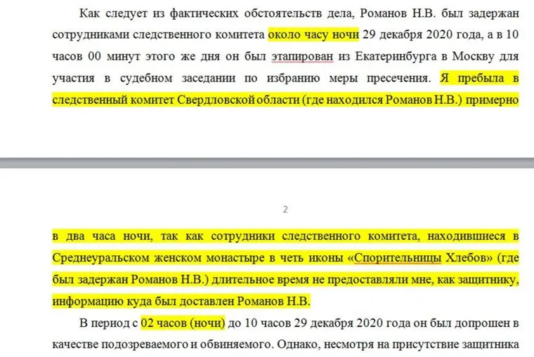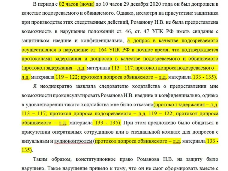 Наконец, сам допрос посреди ночи также является нарушением законодательства. «Допрос в качестве подозреваемого осуществлялся в нарушение ст. 164 УПК РФ в ночное время, что подтверждается протоколами задержания и допросов в качестве подозреваемого и обвиняемого», — говорится в апелляционной жалобе адвоката Герасимовой.