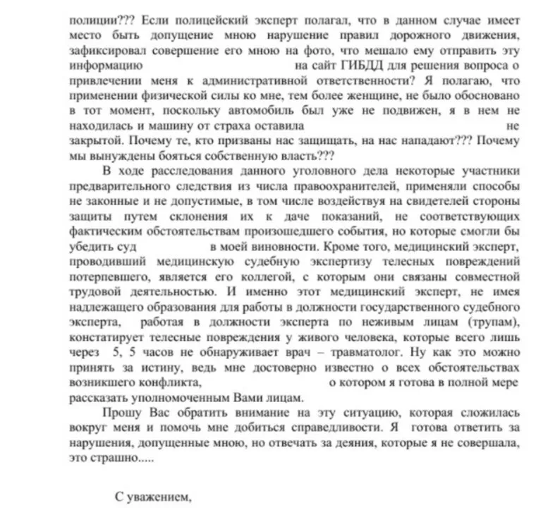 «Мне на помощь прибежали люди, освободили меня от этого мужчины. Лишь в ходе проведения проверки сотрудниками ГИБДД я узнала, что этот мужчина являлся сотрудником полиции — экспертом. Ну разве люди побежали бы на помощь женщине, если бы им было очевидным, что ее задерживает сотрудник полиции», — говорится в обращении.