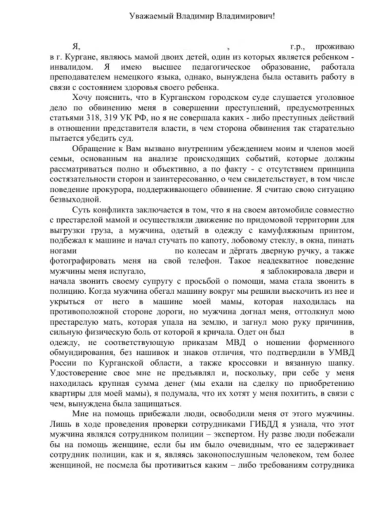 Жительница Кургана после скандала написала Путину. Ее обвиняют в нападении на полицейского