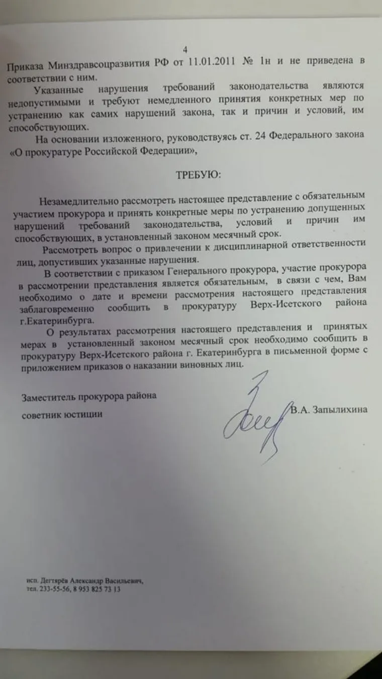 «Флягин М.А. стаж научно-педагогической работы или работы в организациях по направлению профессиональной деятельности, соответствующей деятельности образовательного учреждения, не имеет. Флягин М. А. не соответствует квалификационным требованиям, установленным приказом Минздравсоцразвития РФ к должности проректора образовательного учреждения <…>, а именно отсутствует стаж научно-педагогической работы <…> не менее 5 лет», — говорится в документе. В итоге прокуратура требует принять меры по устранению нарушения и привлечь к дисциплинарной ответственности лиц, допустивших нарушение.