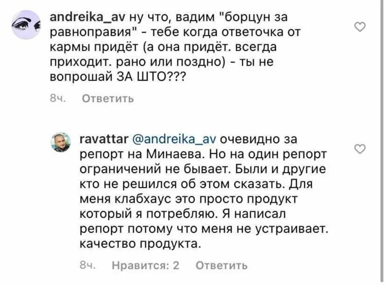 Сам Шарифулин в комментариях на своей странице в Instagram (деятельность запрещена в РФ) подтвердил, что жаловался на Минаева в Clubhouse. Он добавил, что сделал это только один раз. «Были и другие, кто не решился об этом сказать», — пояснил пермяк.