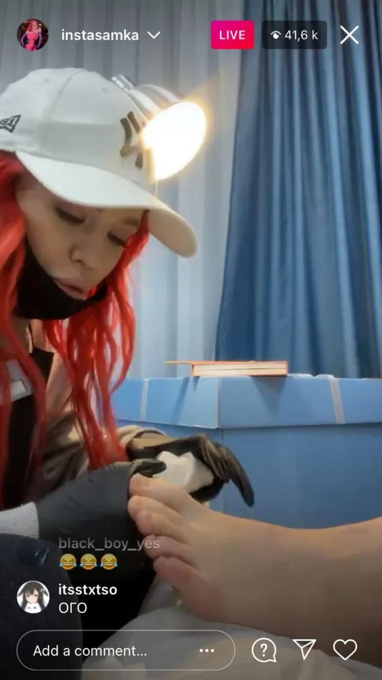 Позднее блогерша запустила в Instagram (деятельность запрещена в РФ) прямую трансляцию своей новой деятельности. На кадрах видно, как Инстасамка сидит в маникюрном кабинете и делает педикюр клиентке. В комментариях лайва девушку стали называть обслуживающим персоналом.
