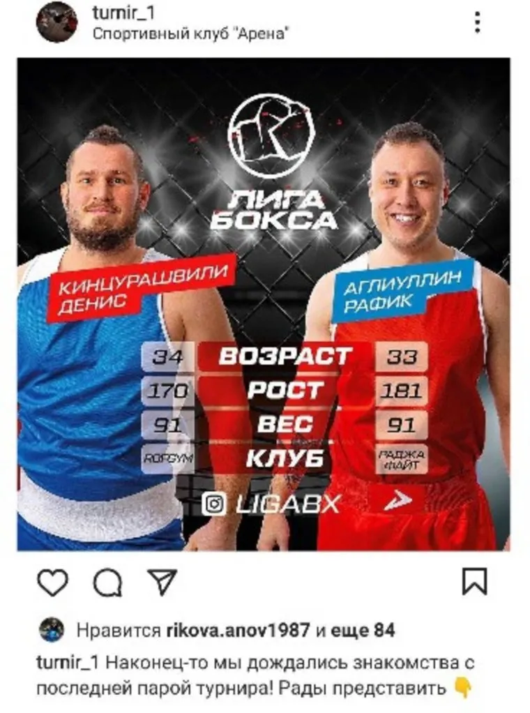«Рафик Аглиуллин — адвокат и начинающий боксер. Спортсмен с большим стажем, но боксом начал заниматься два месяца назад», — говорится в описании боя. Сообщается также, что соревнование состоится на уровне подготовки «новичок-любитель». В пресс-службе тюменского спортивного клуба «Арена» подтвердили информацию о сегодняшнем турнире и обещали прокомментировать ситуацию позже.
