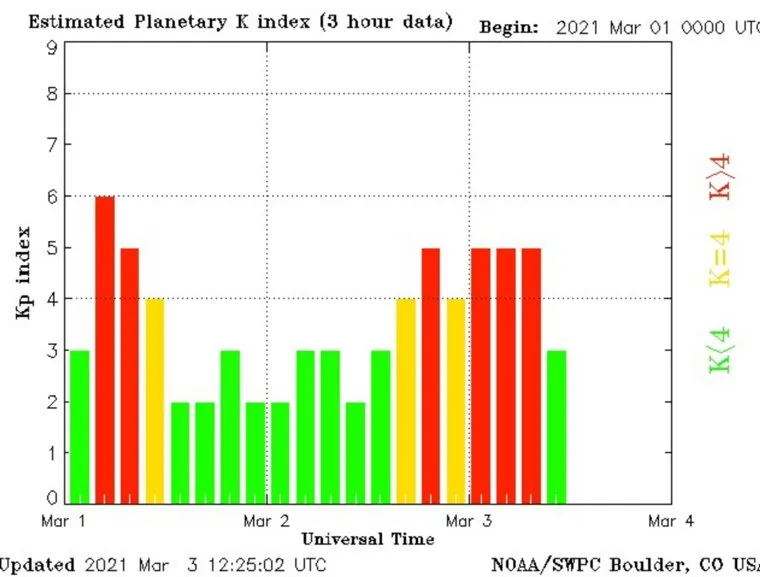 Согласно информации Центра прогнозов космической погоды Национального управления океанических и атмосферных исследований США, первые три дня марта над Землей действовали малые геомагнитные бури. Уровень первой из них в первый день месяца был G2 (Kp=6). Таким образом, она стала сильнейшей в новом цикле солнечной активности.