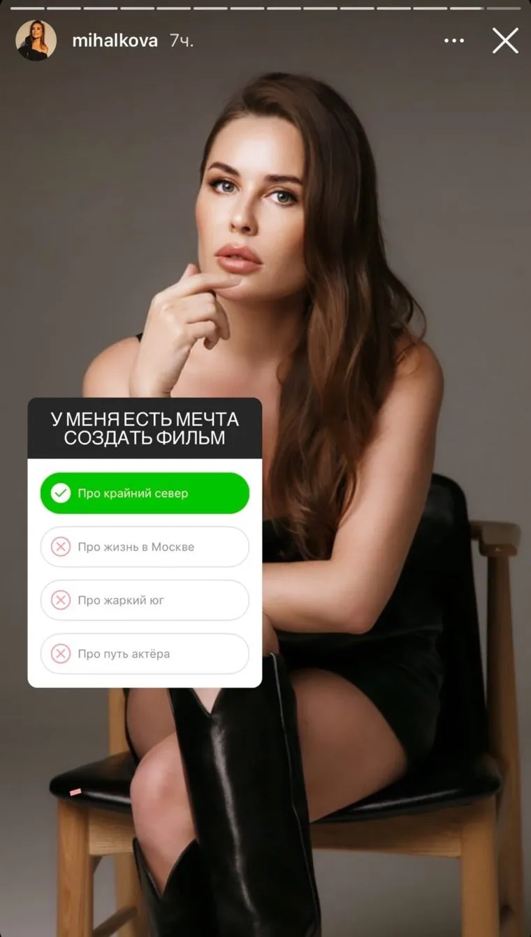 «Я сейчас закончила писать сценарий, 3 месяца я его писала. А до этого прошла курсы по сценарному мастерству. Вы знаете, что у меня большой опыт в написании коротких миниатюр и скетчей, чем я занималась в «Уральских пельменях», — рассказала Михалкова. Актриса попросила подписчиков угадать, какой фильм она мечтает снять. Оказалось, что это картина про Крайний Север.
