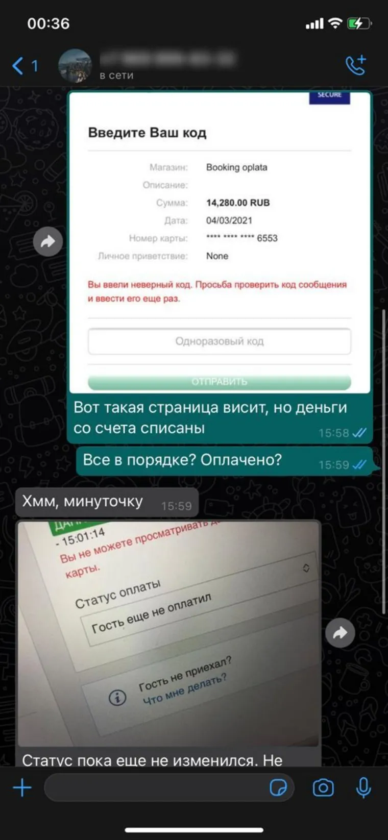 Яна ввела данные своей карты, с которой тут же списали 14 280 рублей, но мошенник в WhatsApp сказал, что деньги не поступили в систему и даже в подтверждение своих слов прислал фото с компьютера. После этого девушка вступила в переписку с якобы техподдержкой системы бронирования. Там ей сообщили, что для возврата средств нужно, чтобы на карте было столько же денег, сколько списали изначально. После этого ей пришел код для оплаты от банка, который Яна ввела в форму мошенников и у нее снова списали 14 280 рублей.