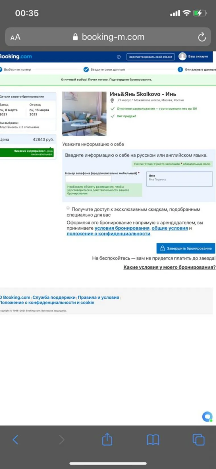 «Я забронировала квартиру в Москве на букинге, мне перезвонил, как я поняла, собственник, мы с ним все согласовали. Через какое-то время мне пришло смс со ссылкой якобы от booking.com. Я перехожу по ссылке и там нужно подтвердить бронирование», — рассказала URA.RU Яна. Девушка все подтвердила и у нее открылась страница с оплатой проживания. Как выяснилось, адрес сайта был незначительно изменен: вместо booking.com было указано booking-m.com.