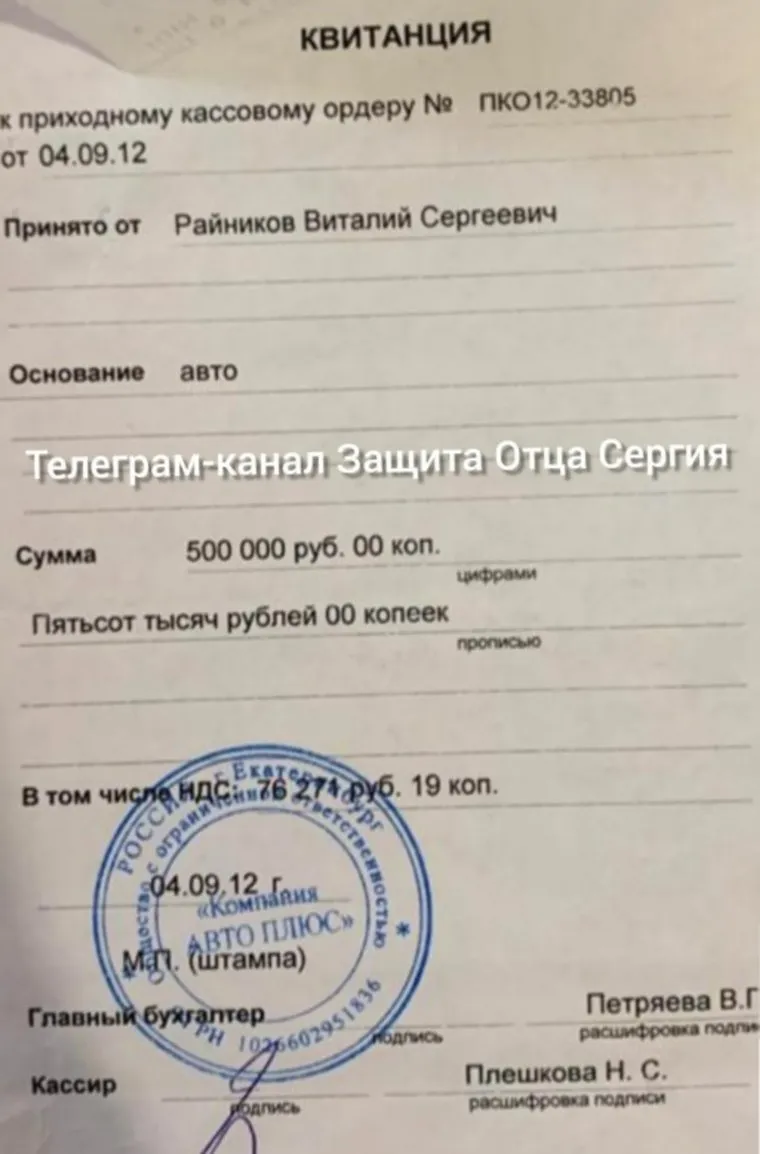 «В обители хранятся оригиналы документов на автомобили, переданные в епархию. Например, договор купли-продажи автомобиля Toyota Highlander стоимостью 1 622 500 рублей, который был приобретен Среднеуральским женским монастырем для митрополита Кирилла Наконечного. И это далеко не единственный автомобиль», — сообщил Павел Бабиков. По его словам, наличие оригинальных документов подтверждает, что конкретный автомобиль куплен именно за счет монастыря и передан Райникову для митрополита.